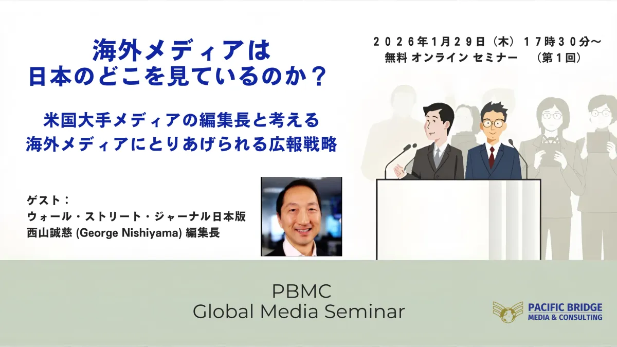 2026年1月29日、株式会社パシフィック ブリッジ メディア アンド コンサルティング(PBMC)が主催するオンラインメディアセミナーが開催されます。今回のテーマは「海外メディアは日本のどこを見ているのか?」です。このセミナーでは、国内外のメディアの特性の違いを理解し、それに基づいた効果的な情報発信の戦略を学ぶことができます。