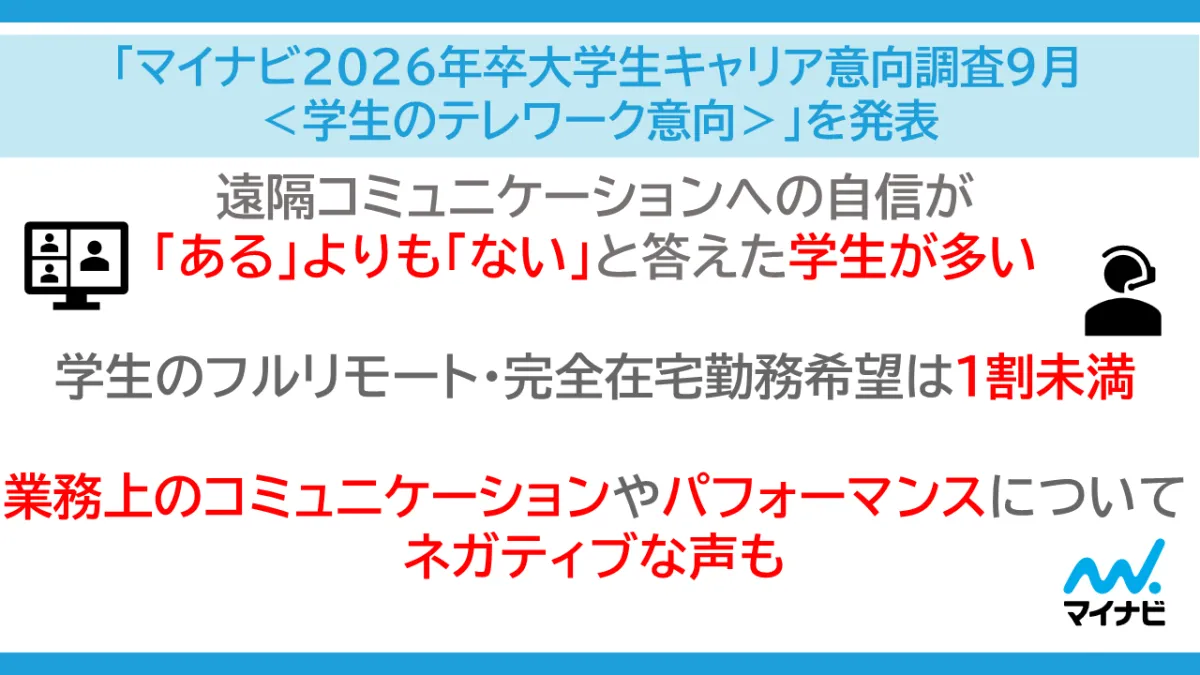 株式会社マイナビが実施した「マイナビ2026年卒大学生キャリア意向調査」の結果が発表され、2026年に卒業を予定している大学生と大学院生のテレワークに対する意向が多角的に分析されました。調査の結果からは、学生たちのテレワークに対する期待と不安が浮き彫りになっています。