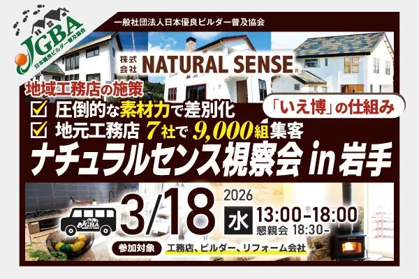 2026年3月18日(水)、一般社団法人日本優良ビルダー普及協会(JGBA)が主催する「ナチュラルセンス視察会」が岩手県で開催されることが決まりました。この視察会は、JGBAの会員企業はもちろん、未会員企業の方々も参加可能なイベントです。
