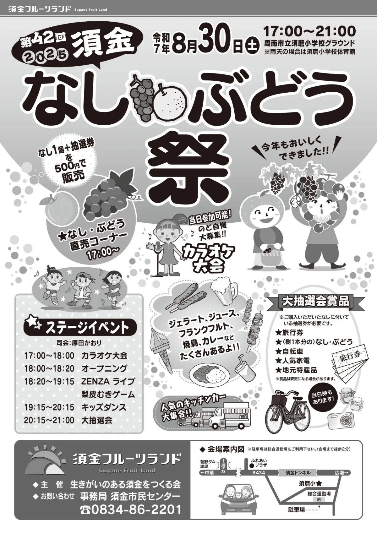 山口県周南市の美しい山間部にある須金地区で、待望の「第42回 須金なし・ぶどう祭」が開催されます。今年の祭りは、令和7年8月30日(土)17:00から21:00まで、周南市立須磨小学校のグラウンドと須金地区の総合運動場にて行われます。