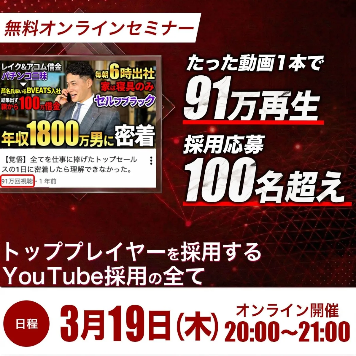 セミナーの中では、実際に運営しているYouTubeチャンネル「人生ぶち上げch」の成功事例を紹介します。このチャンネルでは、一本の密着動画で91万回以上の再生数を記録し、100名を超える採用応募を獲得しました。また、別の動画では59万回再生から7名を採用し、1500万円の売上を生む成果を上げています。これらの具体的な戦略を余すことなく解説し、参加者には自社でのYouTubeを活用した採用手法の設計から実施までのすべてを学ぶことができます。