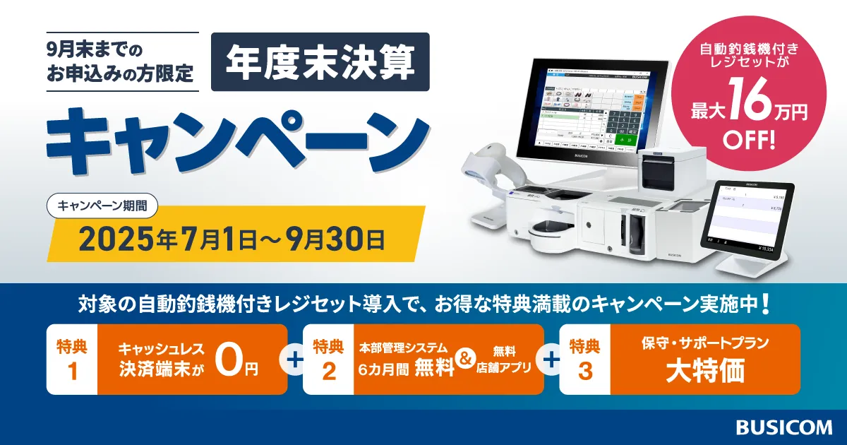 株式会社ビジコムが2025年7月1日から9月30日までの期間限定で、ハイスペックな自動釣銭機付きPOSレジを特別価格で提供する『年度末決算キャンペーン』を実施します。通常価格から最大16万円OFFという驚きのディスカウントとともに、キャッシュレス決済端末を0円で導入可能など、魅力的な特典が盛りだくさん!