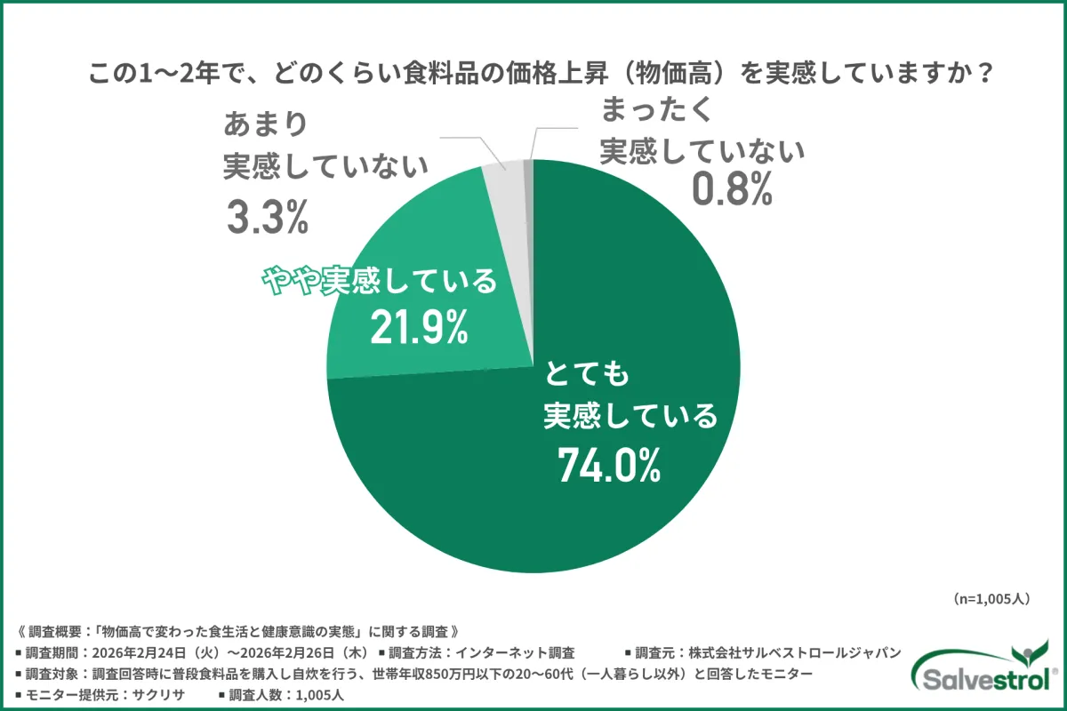 最近、家庭の食卓に変化が訪れています。株式会社サルベストロールジャパンが実施した調査によると、世帯年収850万円以下の20代から60代の世帯で、95.9%が食料品の価格上昇を実感しているとのことです。特に野菜や果物が買い控えられる傾向が見られ、家庭の栄養バランスが崩れつつあることが懸念されています。