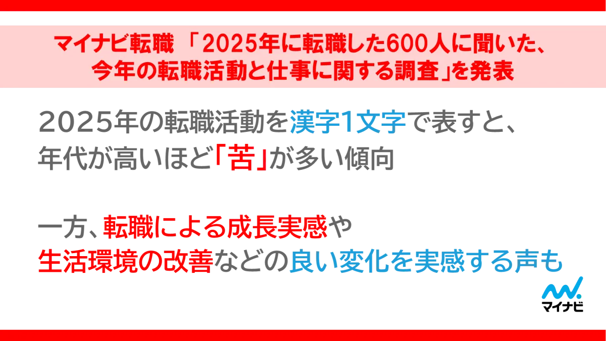 株式会社マイナビが実施した「2025年に転職した600人に聞いた、今年の転職活動と仕事に関する調査」の結果が明らかになりました。この調査は、様々な年代の転職者を対象とし、彼らの転職活動の実態や感じたこと、働き方に対する満足度について探ります。