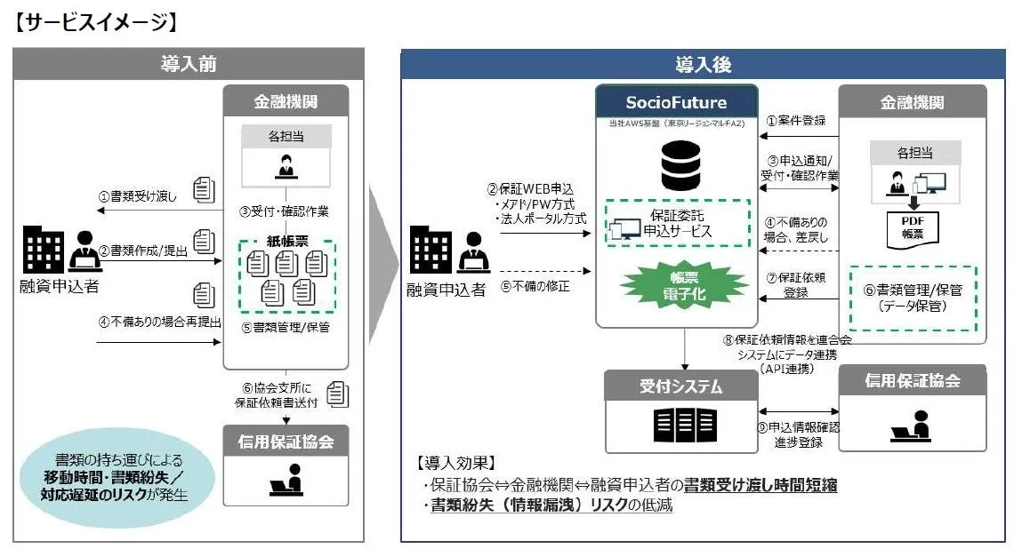 このサービスは、SocioFuture株式会社が提供しており、一般社団法人全国信用保証協会連合会が構築した「信用保証協会電子受付システム」とAPIで接続されています。これにより、金融機関が行う保証委託申込手続きを全面的にデジタル化し、効率化が図られるのです。従来のやり方では、融資申込者や金融機関、信用保証協会の間で書類のやり取りが必要であり、それに伴う時間やリスクが問題視されていました。 書類の紛失や、必要な書類の取り揃えにかかる手間など、さまざまな課題が存在していたためです。