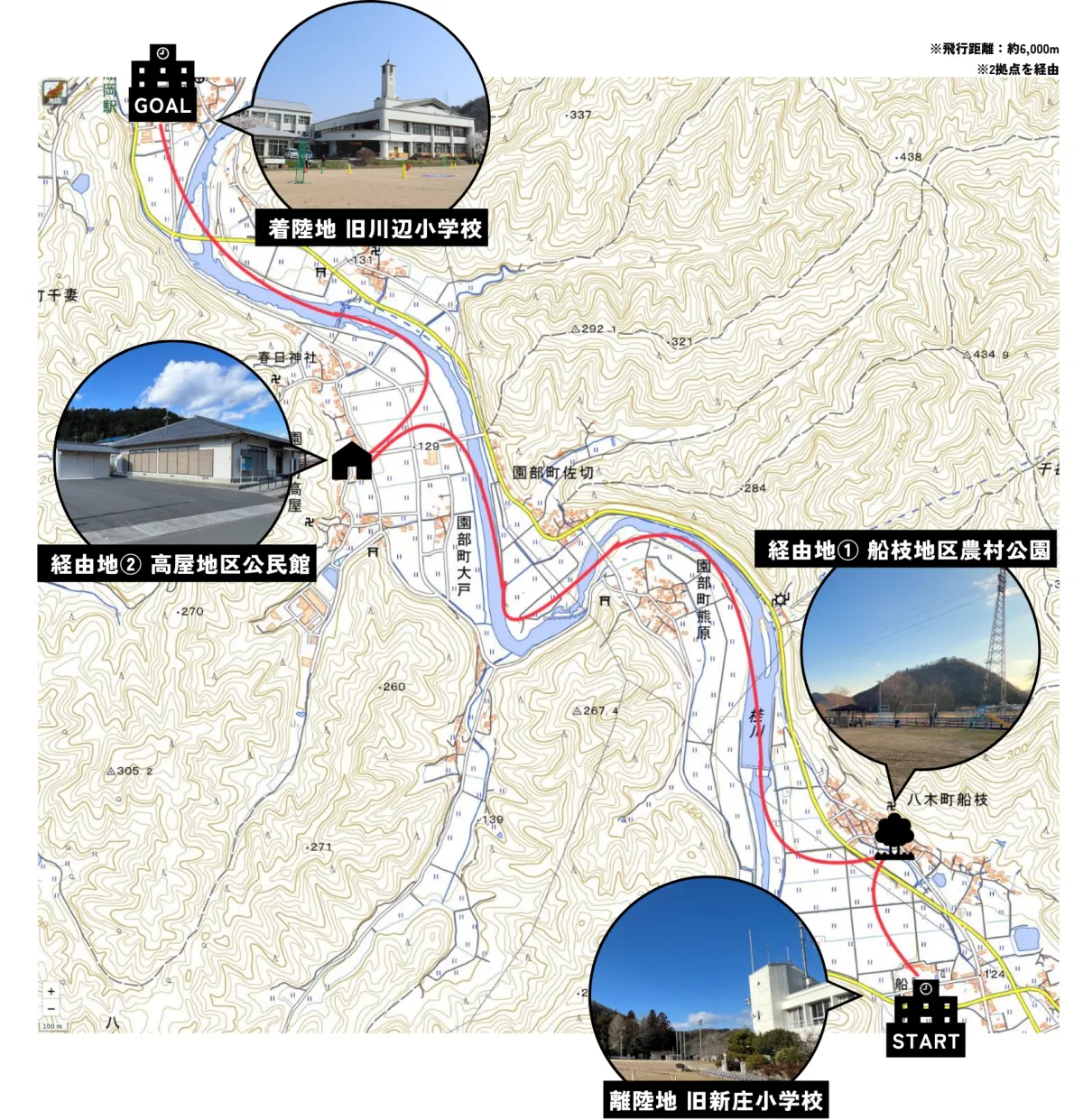 実証実験は、旧川辺小学校から旧新庄小学校間を結ぶ桂川河川の上空において行われ、合計24kgの物資が約6,000mの距離を飛行します。この過程では、2か所の拠点(公民館と公園)を経由し、それぞれに約8kgずつの物資を供給する予定です。