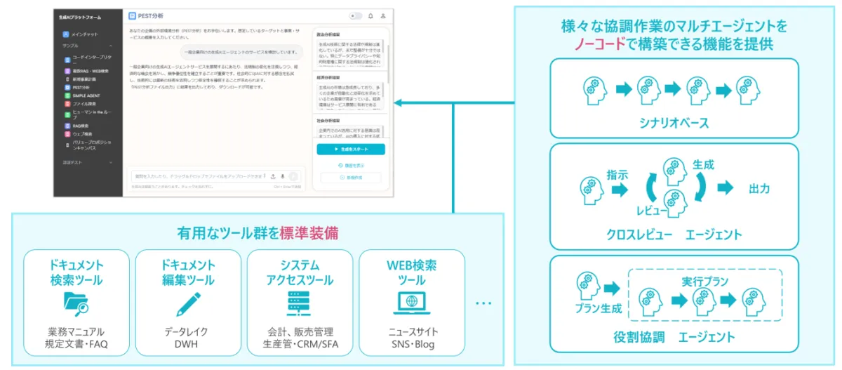 追加されたAIエージェント機能により、企業は生成AIを活用して新しい事業企画の立案や、Excelデータの自動抽出・転記、ドキュメントのレビューなど多種多様な業務を自律的に実行できるようになりました。これにより、業務の効率化が促進され、さまざまな業務タスクに迅速かつ正確に対応することが可能になります。さらに、ユーザーはノーコード開発環境を通じて、専門的なプログラミングの知識がなくても、複数のAIエージェントを組み合わせて独自のアプリケーションを簡単に構築できます。