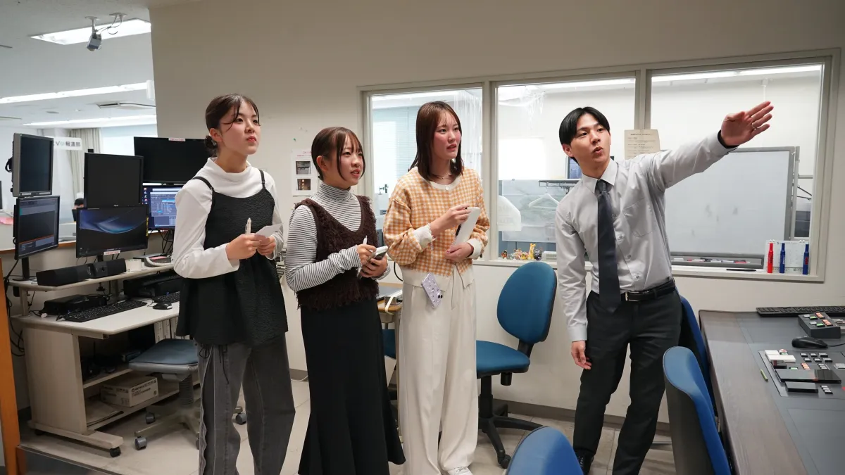 大学生のひめボスレポーターたちはまず、あいテレビの社内を訪れ、石本さんに取材を行いました。入社3年目の石本さんは、経営管理局の総務部で幅広い業務を手掛けています。彼は、経理や決算、採用から施設管理まで多岐にわたり、特に社内プロジェクトチームでは「働きやすさの向上」や「採用広報動画の制作」などに取り組んでいます。