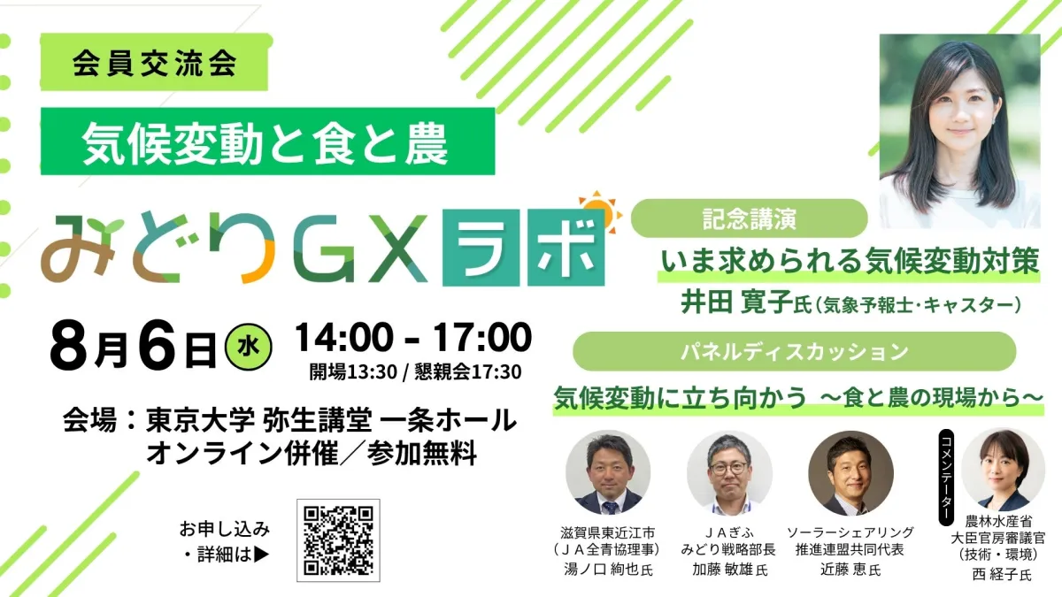 2025年8月6日(水)に、東京大学の弥生講堂で「気候変動と食と農」に関する交流イベントが開催されます。このイベントは、持続可能な食と農の実現を目指す「みどりGXラボ」が主催し、農業者や自治体、企業、消費者など多様な参加者が集まります。