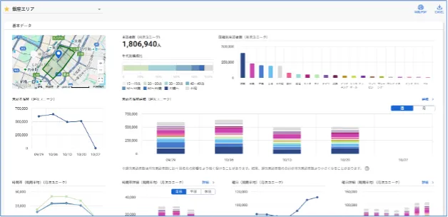 この新機能では、ユーザーは特定の地域やスポット単位でのインバウンド来訪者数を分析することができます。都道府県や市町村ごとに、国籍別の内訳や滞在時間、曜日ごとの来訪者数など、詳細なデータが取得可能です。この機能により、銀座を訪れる外国人の動向をリアルタイムで把握し、その情報をもとに戦略を練ることができます。