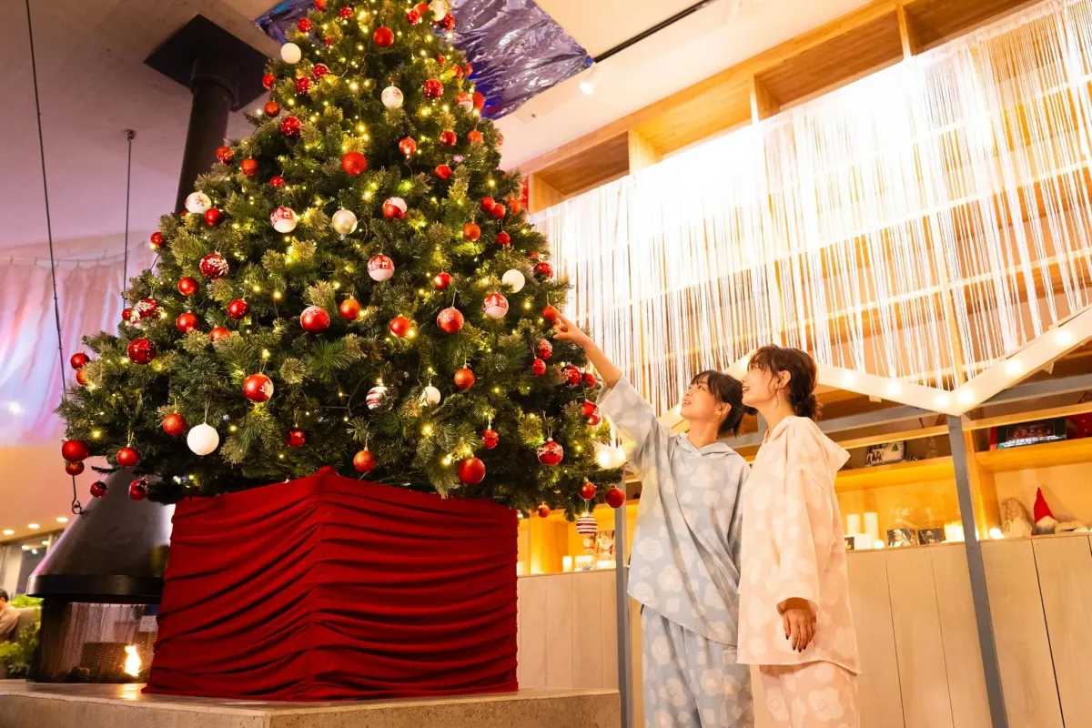 施設内の暖炉前には、高さ約4メートルの巨大クリスマスツリーが飾られ、キラキラと輝くイルミネーションと可愛いオーナメントで彩られています。ここで過ごす時間は、心を温かくしてくれるロマンティックな空間です。