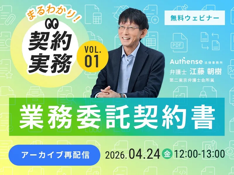 Authense法律事務所(東京都港区)では、好評を受けて昨年8月に開催した「まるわかり!契約実務」シリーズの第一回、業務委託契約書についてのウェビナーを再配信します。このオンラインイベントは2026年4月24日(金)12時から13時までの予定で行われ、参加は無料です。