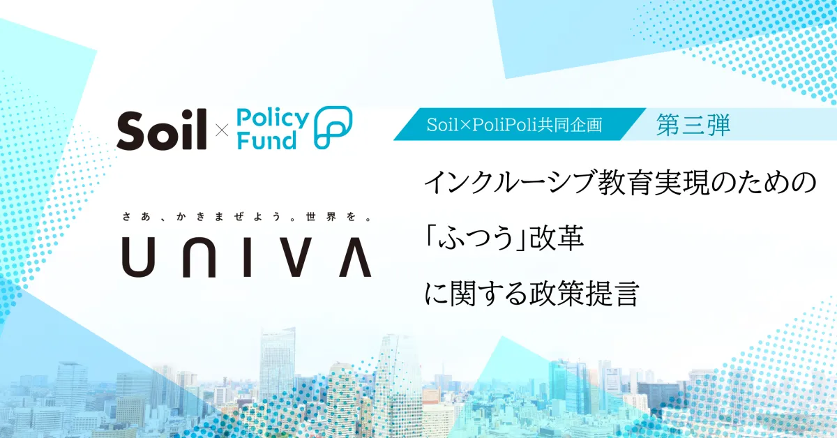 日本社会は現在、人口減少や多様な価値観の共存が求められる時代に突入しています。そのため、地域の学校で多様な子どもたちが共に学びながら成長できる環境の整備が急務です。ここで重要となるのが、「SoilxPolicy Fund」が採択した一般社団法人UNIVAの取り組みです。