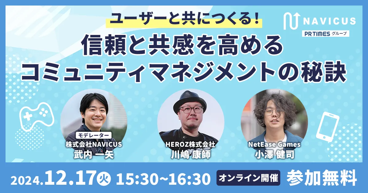 2024年12月17日(火)、オンラインで「ユーザーと共につくる!信頼と共感を高めるコミュニティマネジメントの秘訣」と題したウェビナーが開催されます。このイベントは、株式会社NAVICUS主催で、ゲーム界のプロフェッショナルたちの貴重な知見を無料で学べる絶好の機会です。