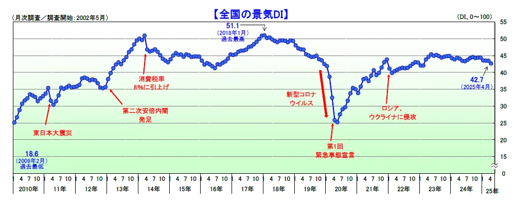 2025年4月の国内景気は、トランプ関税の影響を受けて悪化の兆しを見せています。株式会社帝国データバンクによると、国内の景気DIは前月比0.8ポイント減少し、42.7となりました。この数値は、コロナ禍の終盤にあたる2023年2月以来の低水準であり、国内経済の厳しい状況を物語っています。