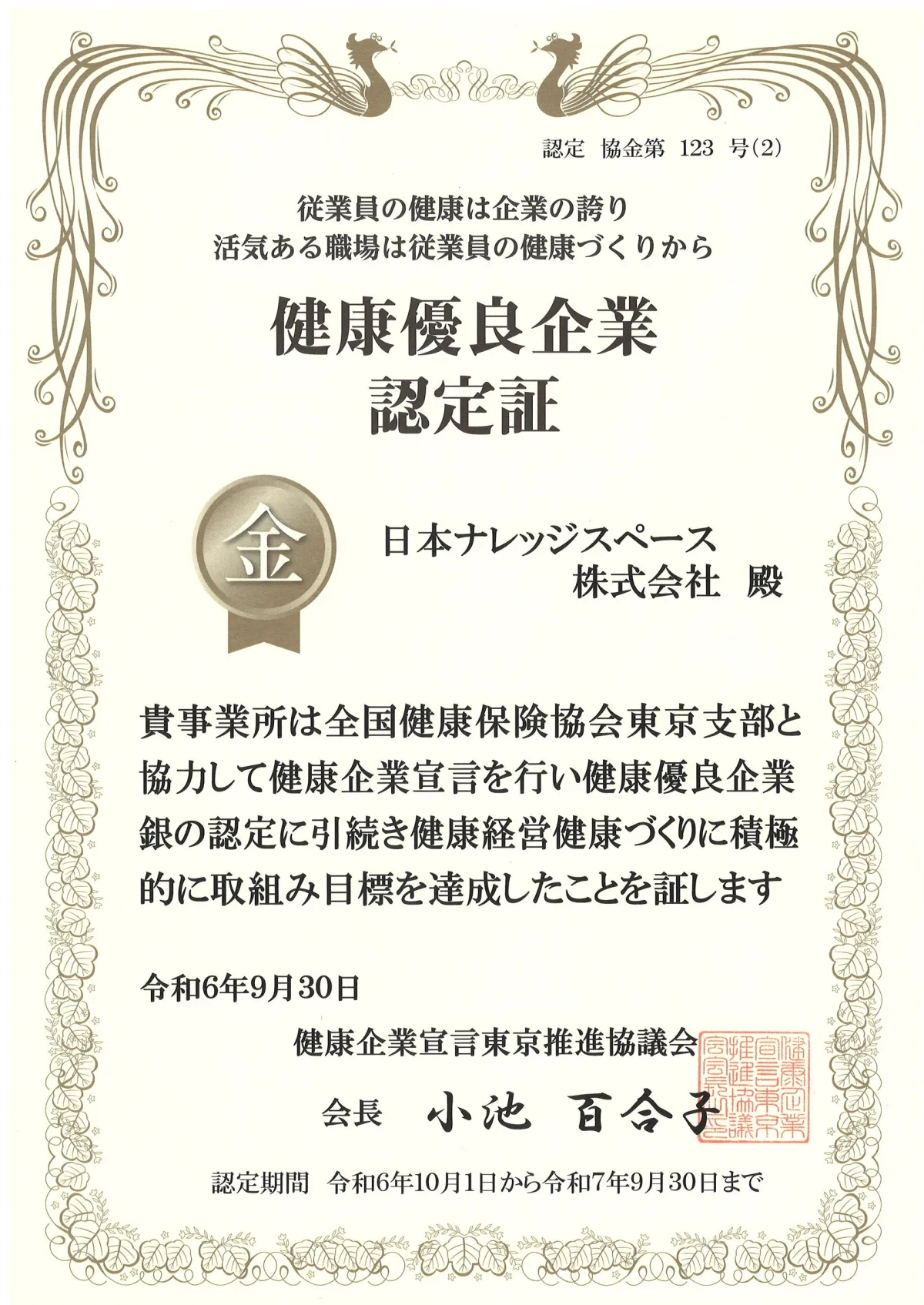 日本ナレッジスペース株式会社は、ここ3年間連続で「健康優良企業(金の認定)」の称号を受けている、まさに健康経営の模範です。この認定は、企業が健康づくりに真剣に取り組んでいる証です。