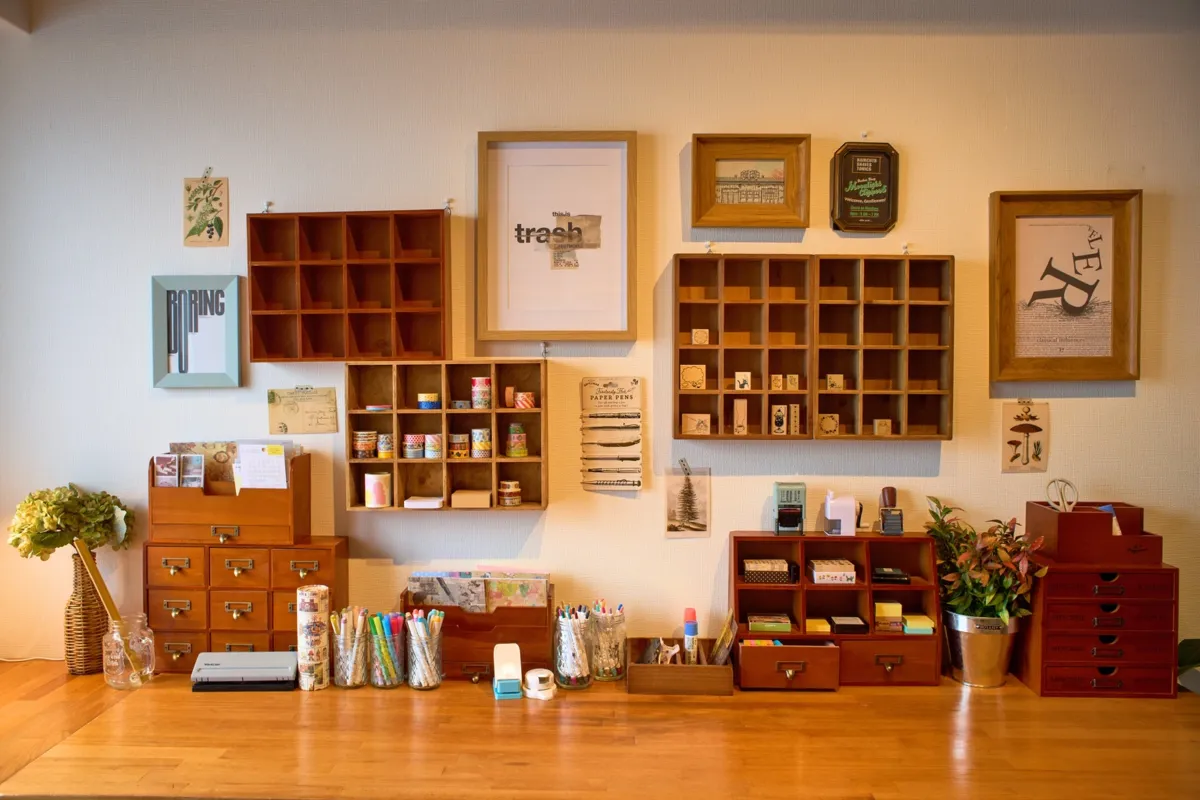 多様な手帳関連文具が用意されており、何十本ものペンや色鉛筆、マスキングテープ、スタンプなどを自由に使うことができます。