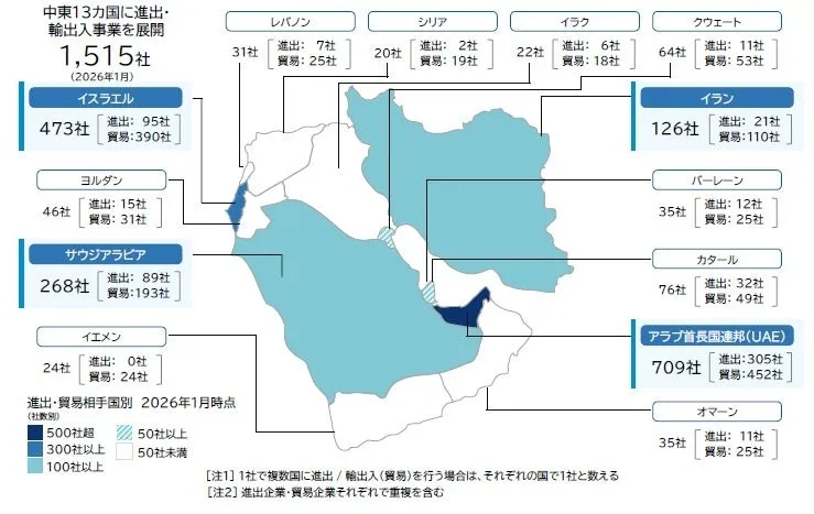 2026年1月時点、アラブ首長国連邦(UAE)を含む中東13カ国での日本企業の進出状況が明らかになりました。その数は合計1515社に上り、特にUAEで709社が活動しています。これは、中東全体の日本企業の半数を越える数字です。UAEの商業環境の良さや、安定した治安が進出の要因とされています。