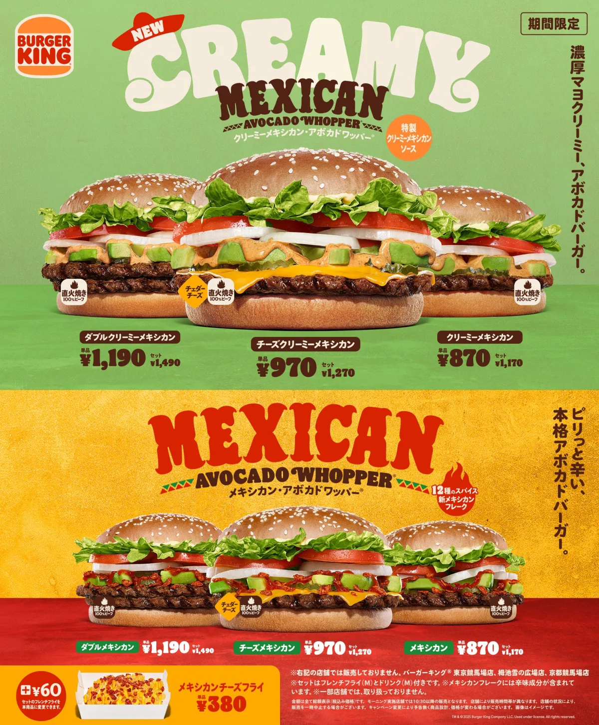 バーガーキング®の新作『クリーミーメキシカン・アボカドワッパー®』3種、そしてサイドメニューの『メキシカンチーズフライ』は、メキシカン料理を感じられる本格的な味わいです。バーガーキング®ファンやメキシカン料理好きの方々に、この機会にぜひ一度味わってみてほしいと思います!