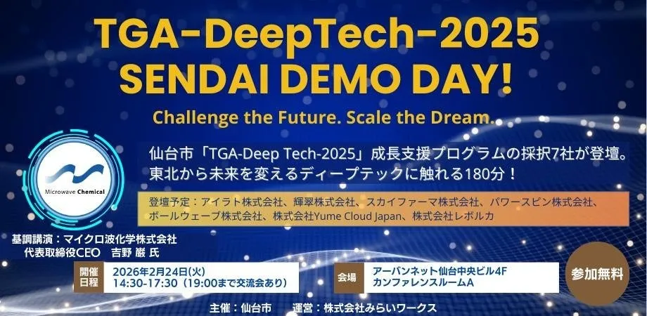 2026年2月24日(火)に、仙台市青葉区にあるアーバンネット仙台中央ビルの「YUI NOS」で開催される『SENDAI DEMODAY!』は、仙台市主催の成長支援プログラム「TGA~DeepTech~2025」に基づく成果発表会です。このイベントは、地域のスタートアップや研究開発型企業の成長を促進するために設けられたもので、特に大学発の研究シーズを活用している企業が集結します。