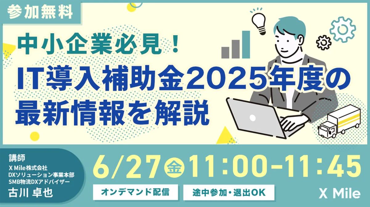 X Mile株式会社は、補助金の活用に関する情報を提供するため、物流業界関係者向けの無料オンラインセミナーを開催することを発表しました。セミナーではIT導入補助金の具体的な申請方法や過去の導入事例を紹介し、デジタル化による業務効率化の具体的な手法を解説します。日時は2025年6月27日で、参加申し込みは公式ページから可能です。