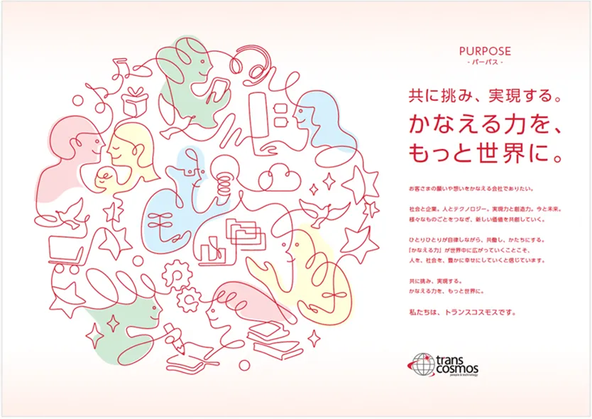 トランスコスモスが掲げるパーパスは、「共に挑み、実現する。かなえる力を、もっと世界に。」。現在のビジネス環境は急速に変化しており、企業には単なる効率性や技術だけでなく、誰とどのように協力して価値を創出していくのかが求められています。トランスコスモスは、顧客や社会との対話を重視し、構想から実行までを共に行うことで、「かなえる力」を広げていくことを目指しています。