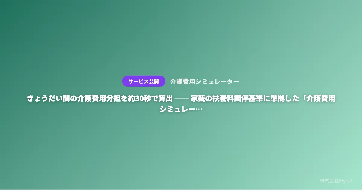 介護は、多くの家庭にとって避けられない現実です。特に兄弟姉妹がいる家庭では、介護費用の分担について悩むことがよくあります。そんな困りごとを解消するため、株式会社Mycatが新たに無料の「介護費用シミュレーター」を公開しました。このツールは、簡単な情報入力で、きょうだい間の負担割合を迅速に算出し、透明性を持った話し合いを促進します。