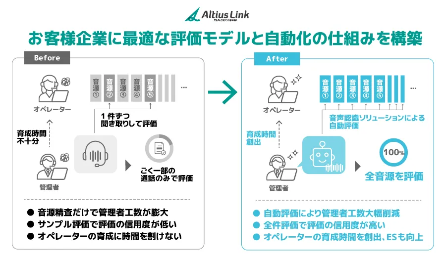 アルティウスリンクでは、「KDDIお客さまセンター」において、AmiVoiceを活用した全通話の自動評価モデルを構築しました。この取り組みにより、管理者の評価工数を約60%も削減。オペレーターは全通話に対して定量的な評価を受けられるようになり、業務の生産性は向上。さらに、従業員の満足度(ES)向上と品質の継続的な改善も実現しました。また、この優れた取り組みは「コンタクトセンター・アワード2024」で最優秀テクノロジー部門賞を受賞しました。