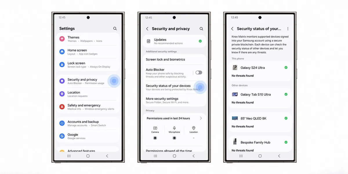 One UI 7の大きな特徴の一つは、Knox Matrixの導入です。これにより、さまざまなデバイス間でのリアルタイムモニタリングが実現し、セキュリティの強化が図られます。たとえば、スマートフォン、テレビ、家電などの状況を一つのダッシュボードで確認でき、すべての機器が安全であることを一目で理解できます。「グリーン」表示で安全が確認され、危険があれば、ダッシュボードには対策の提案も表示されます。