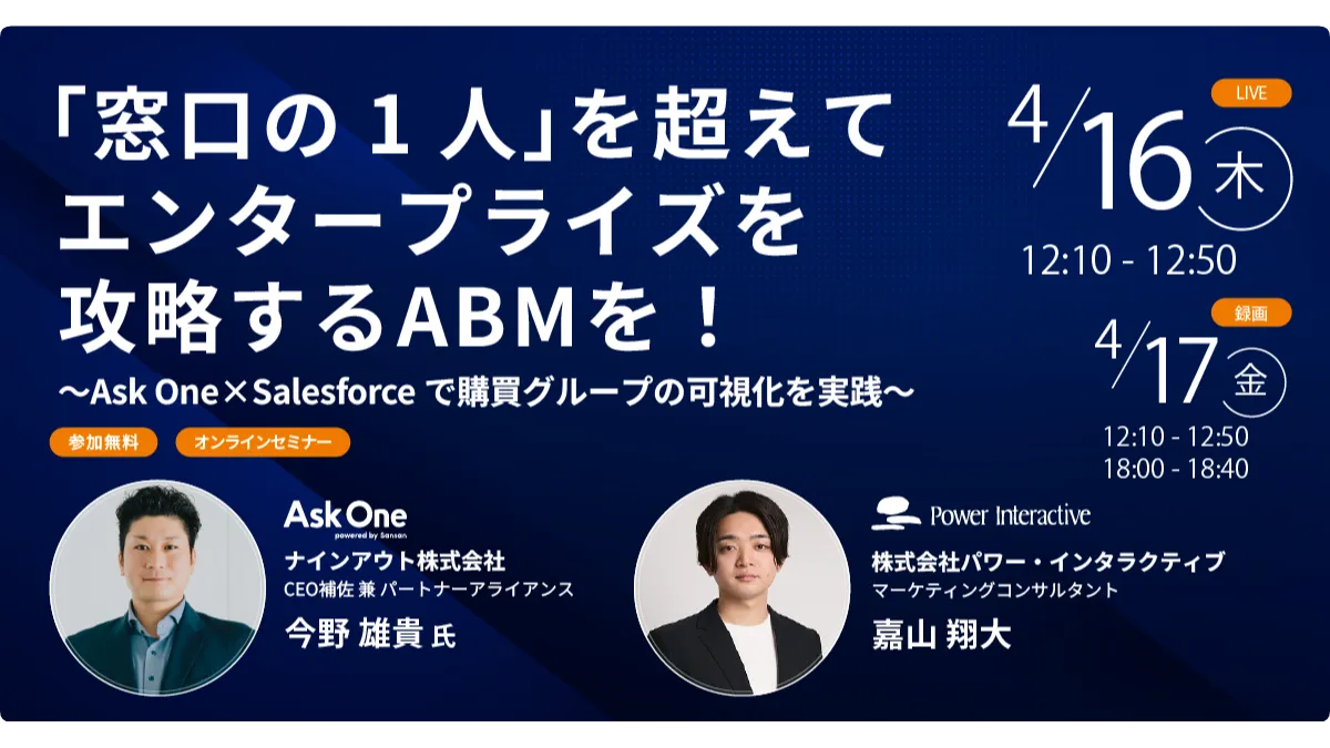2026年4月、株式会社パワー・インタラクティブが主催する無料ウェビナー『「窓口の1人」を超えてエンタープライズを攻略するABMを!〜Ask One×Salesforceで購買グループの可視化を実践〜』が開催されます。このウェビナーでは、BtoB営業における新しいアプローチ、特にアカウントベースドマーケティング(ABM)の重要性が具体的に解説されます。ウェビナーは、4月16日にはライブ配信、翌17日には録画配信が行われ、参加者は無料で受講できます。