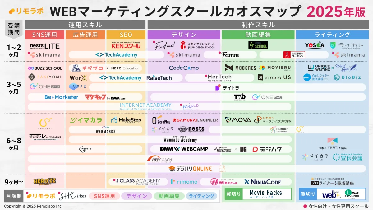 昨今、リスキリングが注目され、多くのWEBマーケティングスクールが誕生していますが、情報の過多や選択肢の膨大さに戸惑う人も少なくありません。そのためリモラボでは、68のマーケティングスクールを“スキル”と“受講期間”の2つの軸で整理した「カオスマップ」を作成しました。これは、受講を希望する人々にとって、各スクールの特徴や受講条件を視覚的に理解するための有用なツールです。