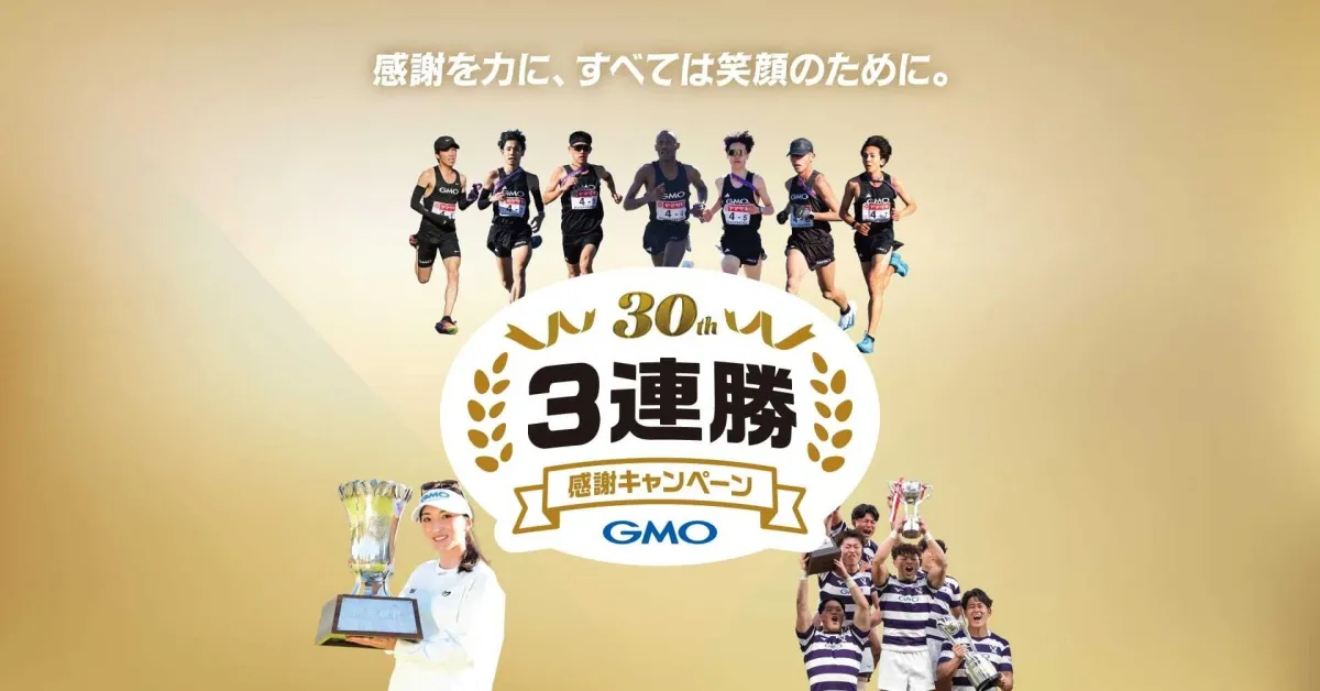1995年12月に事業を開始したGMOインターネットグループは、30年の長きにわたり多様なインターネットサービスを提供してきました。その中で、グループの陸上部が実業団駅伝で日本一を達成、所属プロゴルファーの脇元華さんが国内ゴルフトーナメントで初優勝し、明治大学ラグビー部も全国大会で優勝するという素晴らしい成果を収めました。これにより、各アスリートやチームの活躍を支えてくださった皆さんへの感謝を表現するため、このキャンペーンが始まりました。