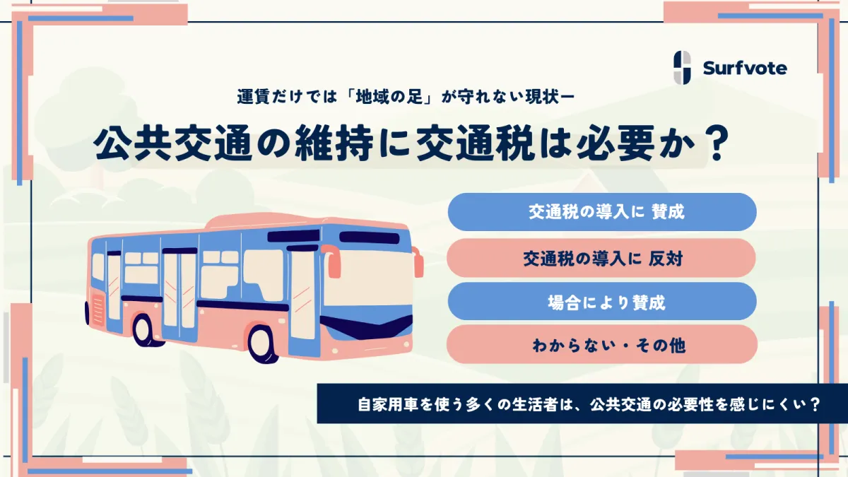 近年、公共の交通機関はその重要性が増している一方で、赤字に苦しむ事業者も少なくありません。特に全国のバス事業者のおよそ99.6%が赤字に転落し、地域によってはローカル鉄道の廃止も進行しています。このような現状を受けて、Polimill株式会社が運営するデジタル民主主義プラットフォーム「Surfvote」では、公共交通の維持に必要な「交通税」についての意見募集を開始しました。この機会に、あなたの考えをぜひお知らせください。