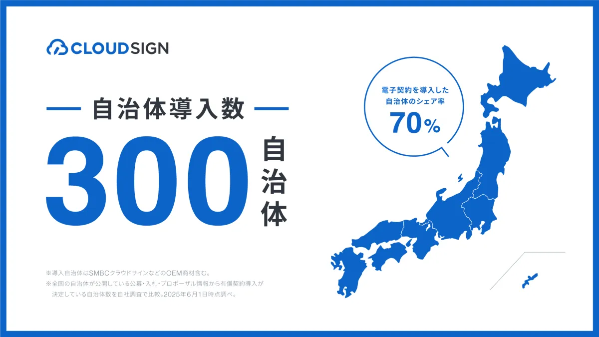 弁護士ドットコム株式会社が提供する契約マネジメントプラットフォーム「クラウドサイン」が、全国の300自治体への導入を達成しました。これは、2025年6月時点の成果として発表されたもので、クラウドサインは約70%のシェアを占めており、地方自治体においては最も利用されている電子契約サービスです。