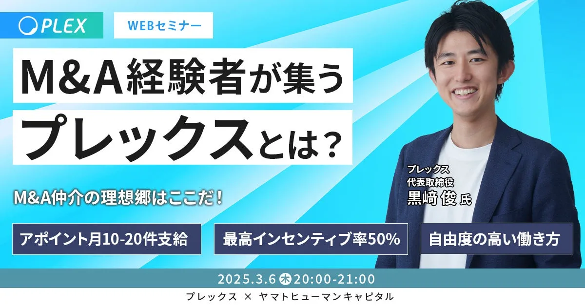 2025年3月6日、M&A仲介の業界で新たな魅力を持つ株式会社プレックスについてのウェビナーが開催されます。このウェビナーでは、同社の代表取締役である黒﨑俊氏がM&A専門家たちを対象に、業界の現状やプレックスの提供する環境について語ります。