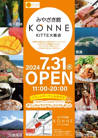 新たにオープンする"みやざき館KONNEKITTE大阪店"は、アクセスも便利で大阪梅田駅から徒歩圏内。観光客や地元の方々にとって立ち寄りやすい場所に位置しています。ぜひ、この機会に宮崎の魅力と美味しさを感じてみてください。もっと多くの人々に宮崎の素晴らしさが伝わることを願っています。
