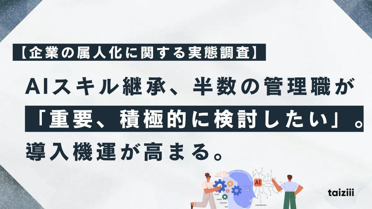 株式会社taiziiiが実施した「企業の属人化・技術継承に関する実態調査」によると、参加した200名の管理職の約半数が「AIによるスキル継承システム」の導入を積極的に検討したいと回答しました。この数字は、スキル継承が企業の将来に対しての重要な課題であることを示しています。