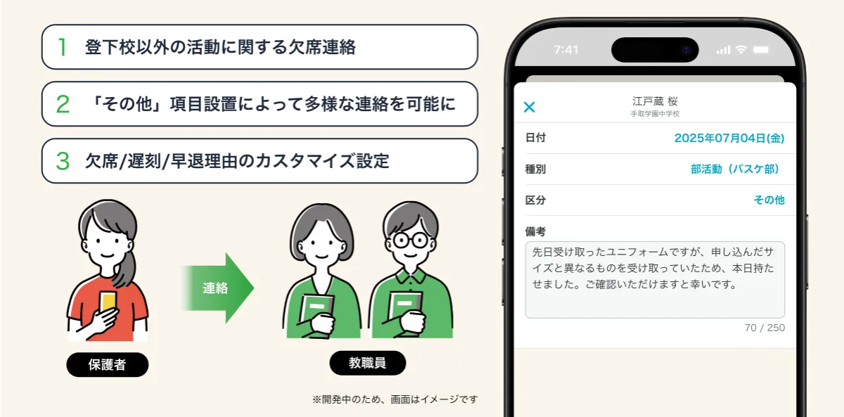 「欠席連絡カスタマイズ機能」は、学校の様々なニーズに応じて欠席連絡の項目や内容を設定できることが大きな特徴です。これにより、部活動やプールなどの登下校以外の活動に関連する欠席連絡も受けられるようになります。また、欠席・遅刻・早退に加えて、持ち物忘れや急な相談などの連絡を含めた「その他」の項目を設けることで、より多様なコミュニケーションが可能となります。