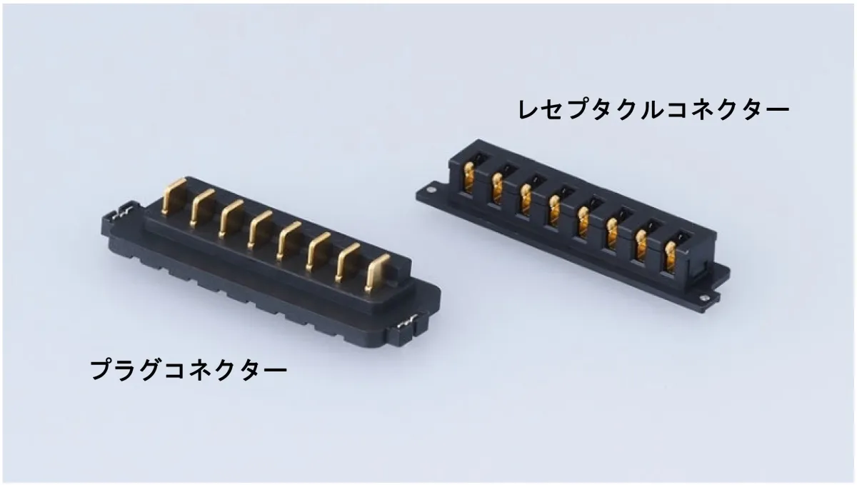 新型の防水ツーピースコネクターは、プラグコネクターとレセプタクルコネクターのツーピース構造を採用しており、それぞれを嵌合させて使用します。特に注目すべきは、接点に2点のフローティング構造を持つことで、耐振動性能や耐衝撃性能を向上させている点です。
