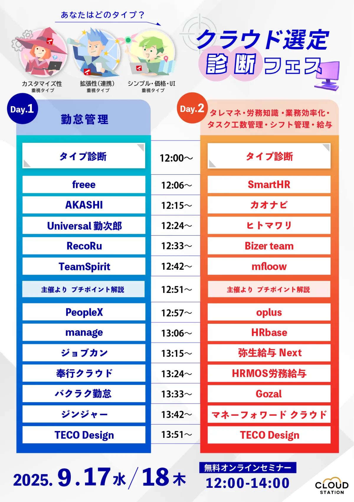2025年9月17日(水)から2日間にわたり、株式会社TECO Designが主催するオンラインセミナー『🔍あなたはどのタイプ?クラウド選定診断フェス📋(通称:診断フェス)』が開催されます。このイベントは、人事労務クラウドの導入を検討している企業の担当者や士業者向けに設計されており、参加者が自社に最適なクラウドソリューションを見つける手助けをすることを目的としています。
