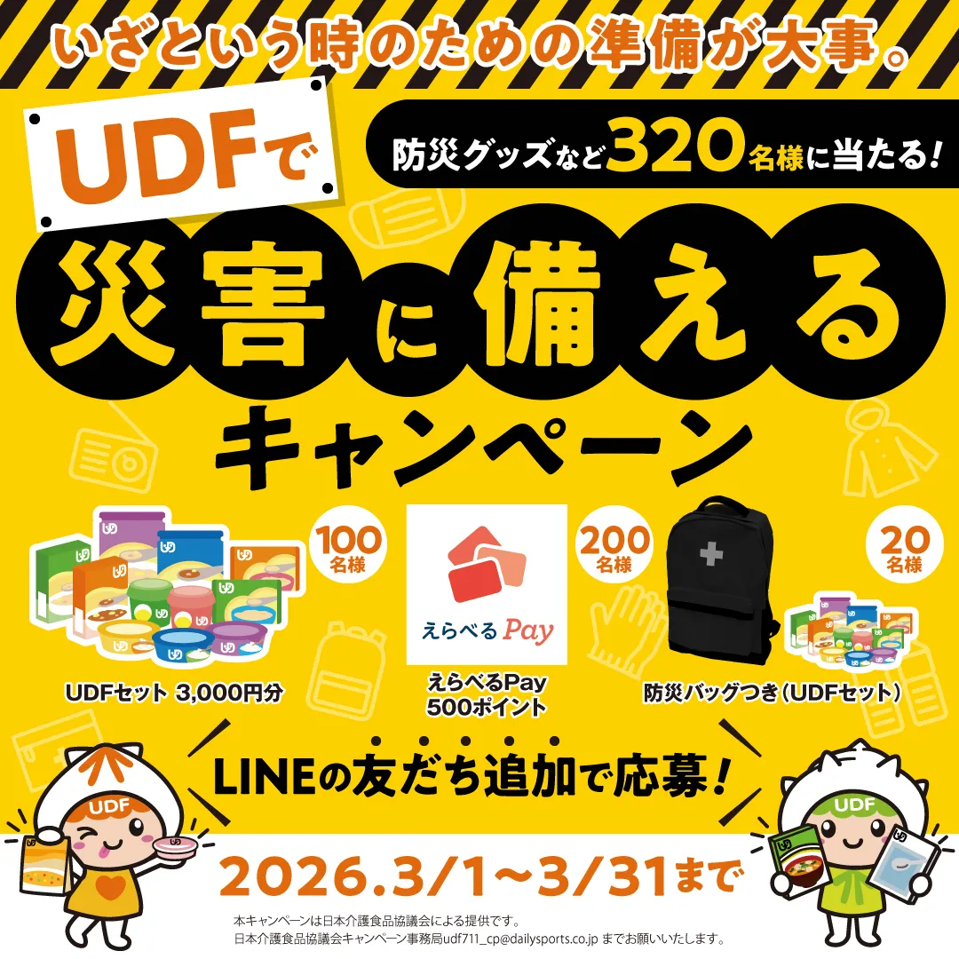 初めに、公式LINEを使ったキャンペーンでは、友だち追加と簡単なアンケート回答を行うことで、320名に防災グッズやユニバーサルデザインフード(UDF)セットが抽選でプレゼントされます。また、在宅訪問管理栄養士が監修した「UDF利用者のための災害備蓄チェックリスト」もダウンロードでき、日常的な備えを促進する内容となっています。