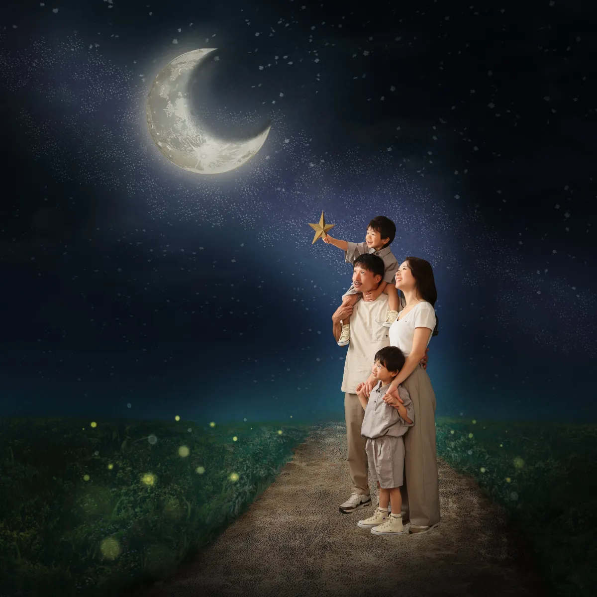 このイベントに訪れた家族は、まるで絵本の中にいるかのような体験を楽しむことができます。具体的には、家族全員やお子様一人でも参加可能で、夜空の三日月を見上げるポーズでの撮影が行われます。撮影された写真は、特別に用意された絵本のような背景イラストと合成され、より幻想的な作品に仕上げられます。所要時間は短く、涼しいスタジオで快適に過ごしながら、子供たちも楽しめる内容となっています。