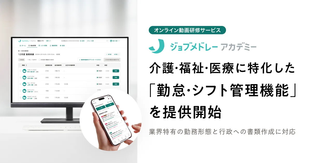 ジョブメドレーアカデミーは、ユーザーが専門家による7,500本以上の動画で学べるオンライン研修を提供しており、受講者数は29万人を超えています。学びやすさとともに、利用者や患者と向き合う時間を創出し、ケアの質向上に寄与する構えです。総合的な視点から、介護業界の働き方改革を支援する、この新たな勤怠・シフト管理機能が今後どう発展していくのかが注目です。