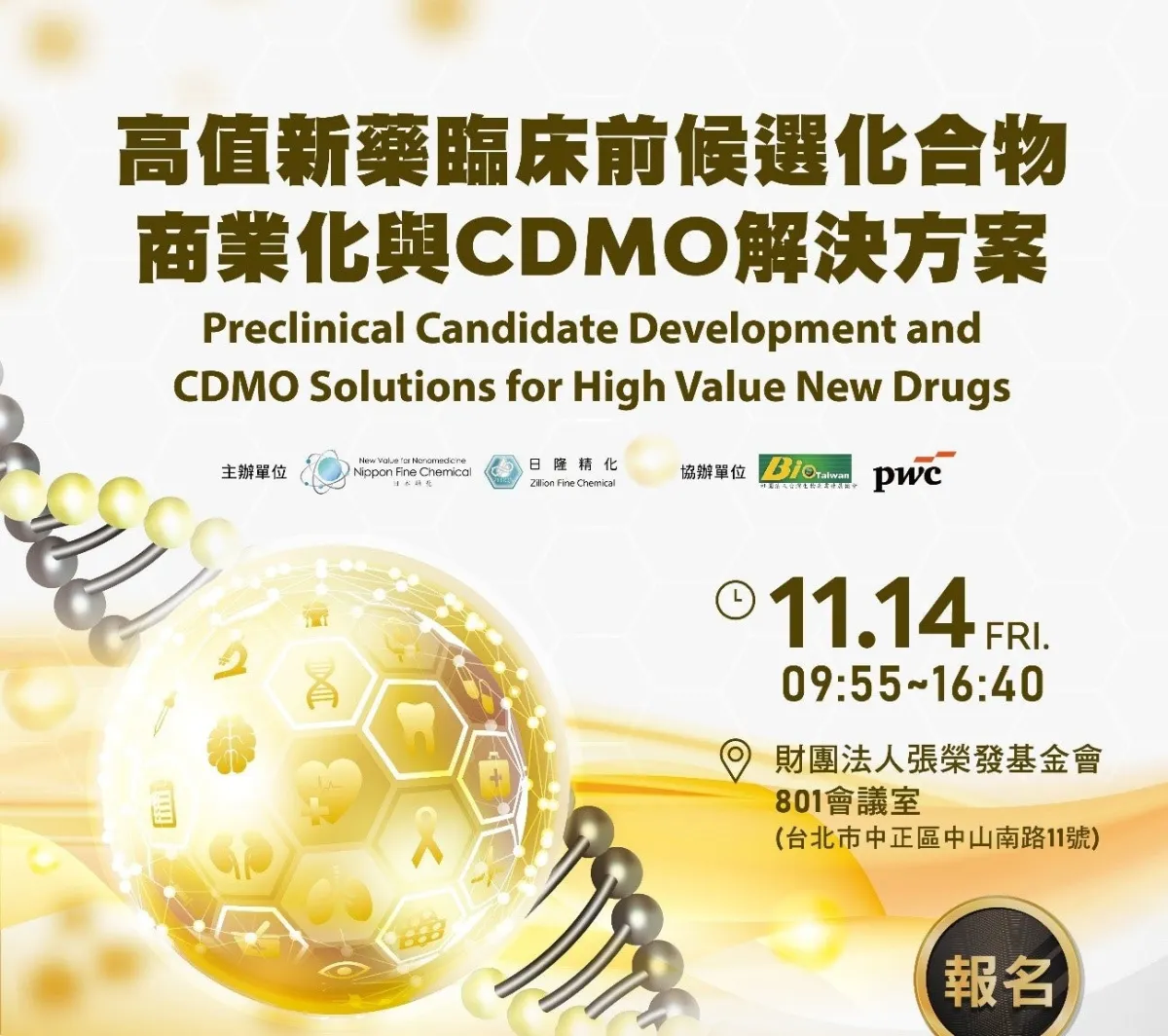 日本精化株式会社は、2025年11月14日、台北市にある張榮發基金会国際会議センターで医薬品開発に関連するセミナーを開催しました。このセミナーのテーマは「高付加価値な新薬前臨床候補化合物の商業化およびCDMOソリューション」です。今回のイベントには、約100名が参加し、医療やバイオテクノロジー分野における最新の情報を共有しました。