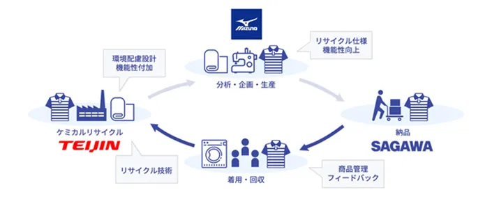 この取り組みでは、まず佐川急便がユニフォームのデザインと機能を新しい仕様に変更します。これにより、着用状況や着心地、機能性を向上させ、使用済みユニフォームの供給を安定させることを目指します。ミズノは、リサイクルしやすい100%ポリエステル製のポロシャツを供給し、効率的な回収プロセスを整備します。また、帝人フロンティアは、回収された素材をケミカルリサイクルで再資源化し、効率的な繊維から繊維への循環を実現するために高機能素材の開発を進めます。