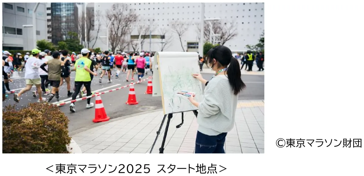 このドローイングランナー展では、東京藝術大学の学生アーティストたちが、2025年に開催される東京マラソンのスタート地点で捉えたランナーたちの姿や大会の雰囲気を、スピーディーに描いたクロッキー作品が展示されます。