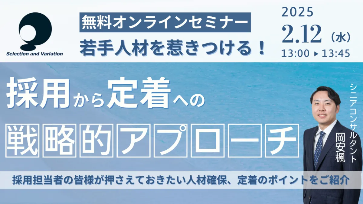 セレクションアンドバリエーション株式会社が主催する、若手人材を惹きつけるセミナーが2025年2月12日にオンラインで開催されます。このセミナーでは、現代の採用活動に求められる新たなアプローチや効果的な人事戦略について掘り下げていきます。