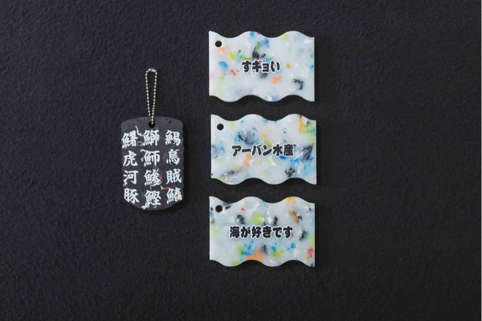 キーチャームには、日本近海で捕れる生き物の漢字が刻まれた湯呑みをモチーフにしたデザインが含まれています。また、漁師が掲げる大漁旗を再現したものもあり、色とりどりのプラスチック素材で表現されています。このように、アイテムの奥には海洋環境を守りたいという情熱が溢れています。