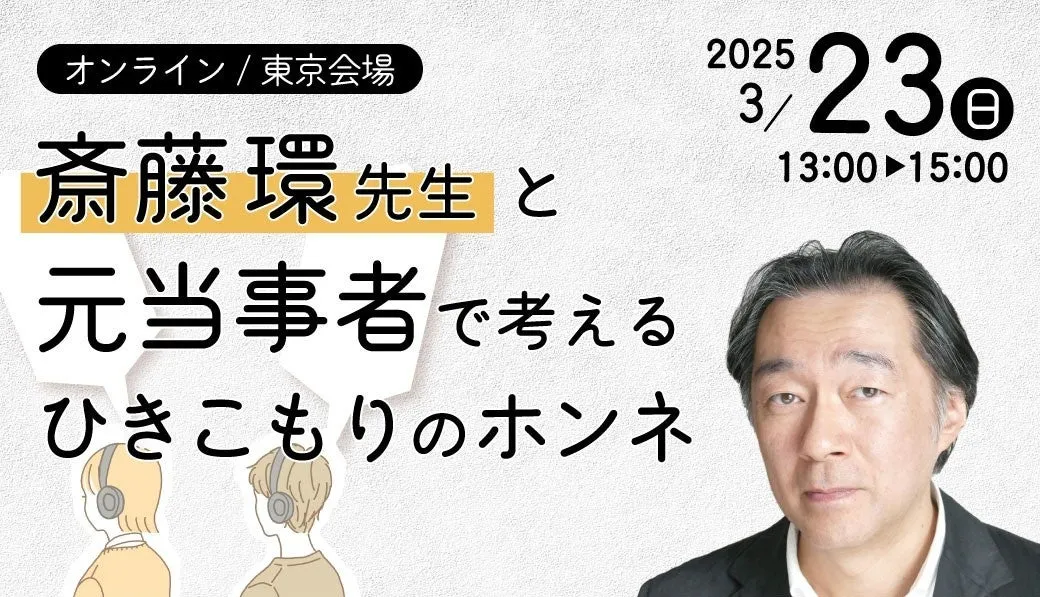 当イベントには、筑波大学名誉教授であり、日本思春期学会理事、日本病跡学会理事でもある斎藤環先生を歓迎します。彼は多くの著書を持ち、ひきこもりや不登校の問題についての専門家です。また、元ひきこもり当事者を2名お招きし、彼らの経験を生かしたお話を伺います。