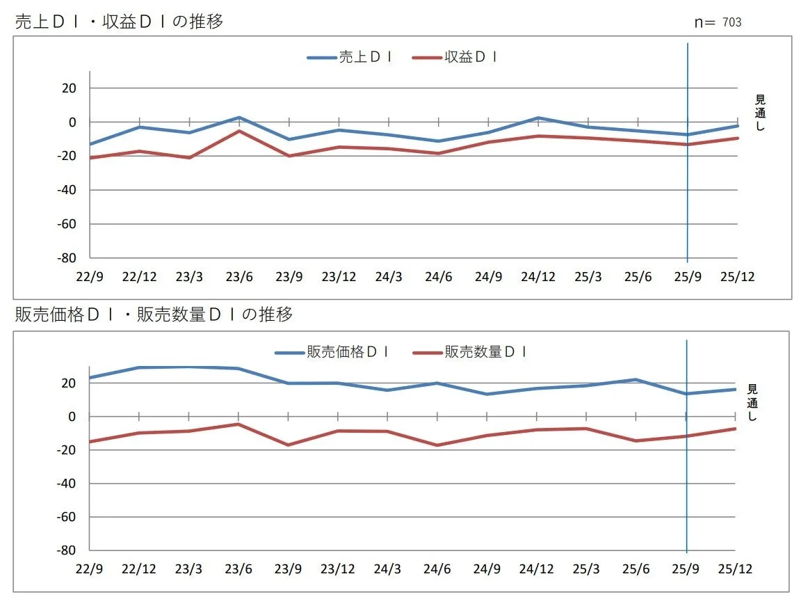 具体的には、製造業の売上DIは-13.7、小売業が-16.4、サービス業が-11.4にまで落ち込んでいます。運輸業だけは19.4と上昇していますが、全体的には厳しい状況です。トランプ関税の影響も燻り続けており、消費者に近い業種は特に苦しい立場に立たされています。2025年10~12月期に向けては、売上DIが5.1ポイント、収益DIが3.7ポイントの上昇が予測されていますが、実際にその通りになるかは見通しが難しいところです。